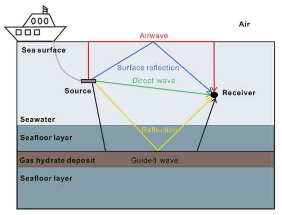 Figure 1 shows the main propagation paths of different EM waves induced by a dipole source. As mentioned before, the airwave is part of the propagating EM fields (see Equations (1) and (2)) mainly reflected from the sea surface (red line in Figure 1). The hydrate target related EM signals are the reflection wave and the guided wave, which are indicated by the yellow line and the black line, respectively.