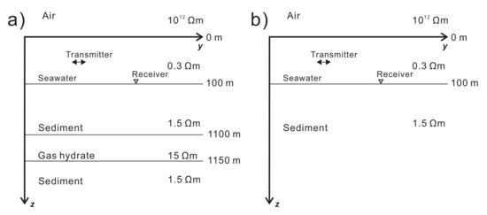 We first test a 1D gas hydrate model modified after Constable and Weiss [76] (Figure 2). The hydrate reservoir model is composed of five layers including the air, the seawater and seafloor sediments and gas hydrate. The setting of the resistivity of the hydrate is following Goswami [4]. The air is a half-space of the resistivity (i.e., the conductivity is ). The seawater layer is of thickness 100 m and its resistivity is . From the depth of 1100 m, there is a gas hydrate layer of thickness 50 m and its resistivity is . The background sediments are of the resistivity . An electric dipole source is placed at . The transmitting frequencies used are 0.5 and 1.25 Hz for detecting shallow hydrate targets following Schwalenberg et al. [31]. The seafloor receivers are distributed evenly along the inline direction y from 500 m to 9500 m. The receiver interval is 100 m. We use the code given by Li and Li [73] to compute the frequency-domain 1D marine CSEM fields.