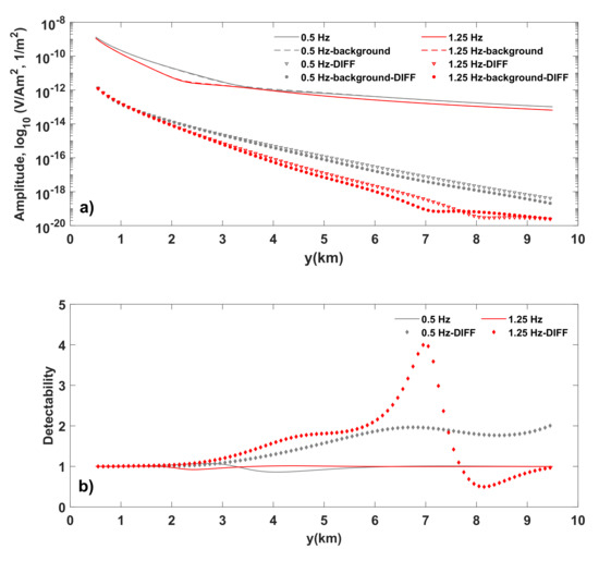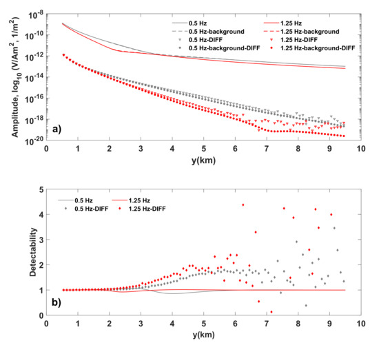 Figure 3 shows the inline electric field and its weighted differences (see solid and inverse triangles in Figure 3a) and the corresponding detectivity (see the solid line and diamonds in Figure 3b). Note that the amplitude of the inline electric field and its weighted differences for the background model (Figure 2b) is also given for comparison (see dashed line and dots in Figure 3b). The transmitting frequencies 0.5 and 1.25 Hz are indicated by gray and red, respectively.