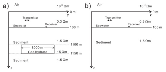 We also test a 2D model to further investigate the weighted differential method. The 2D model (Figure 4) is modified after the 1D case (Figure 2), except that its hydrate deposit is of finite horizontal length of 8000 m. The transmitter–receiver layout is the same as in the 1D test. The receivers are along the inline direction y from 500 m to 5500 m with an even interval 100 m. The code given by Li and Han [30] and Li et al. [37] is used to perform the frequency-domain 2D marine CSEM field simulation.