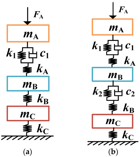 In the dynamic modeling of the vibration isolation system, the power system is typically assumed to connect to a rigid foundation by the vibration isolator. In the modelling of underwater vehicles, the deck of the shaft is treated as a rigid foundation with infinite mass and stiffness. Obviously, this assumption is not physically accurate. Considering the influence of the stiffness and mass of the foundation, the elastic foundation could be identified by a mass–spring system. For the studied AUG, the power system, battery and wing are modularly connected. Therefore, a three-degrees-of-freedom mass–spring system is established considering the stiffness of the power system, battery and wing in the dynamic modelling. Figure 5 displays the dynamic models of the vibration isolation system of the AUG. Figure 5a shows the single-stage vibration isolator. Figure 5b shows the two-stage vibration isolator. In Figure 5, kA, kB, kC, k1 and k2 denote the stiffness of power system, the battery, the wing, the first-order vibration isolator and the second-order vibration isolator in the AUG, respectively. c1 and c2 denote the damping of the first-order vibration isolator and the second-order vibration isolator in the AUG, respectively.