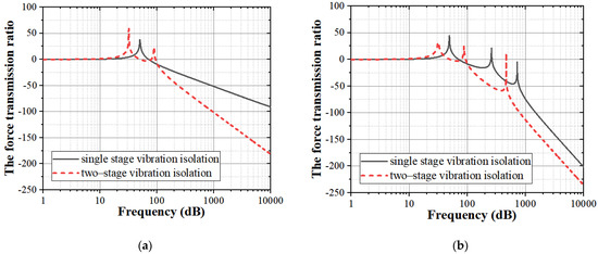 The force transmission ratios of the single- and two-stage vibration isolation: (a) without considering the structure stiffness; (b) considering the structure stiffness.