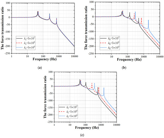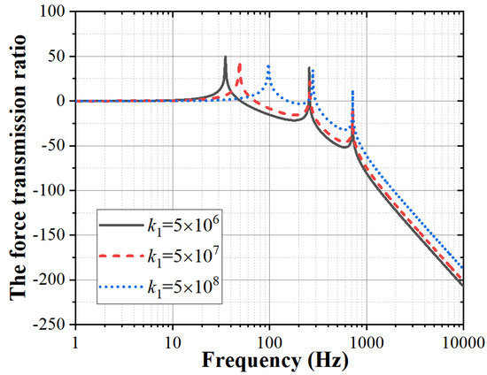 The force transmission ratios of the single-stage vibration isolation with different isolator stiffnesses.