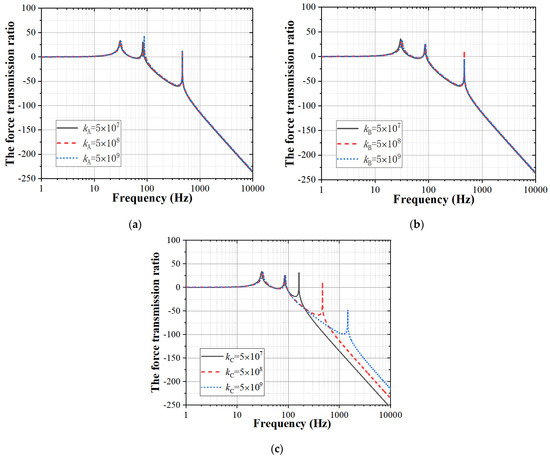 According to the vibration isolation theory, the force transmission ratio is affected by the stiffness of the structure. In the dynamic model of the AUG, the stiffness parameters are kA, kB, kC, k1 and k2. The influences of kA, kB, and kC on the force transmission ratios of the AUG are discussed in the following cases. Figure 9 and Figure 10 show the influences of kA, kB, and kC on the force transmission ratios of the single- and two-stage vibration isolation in the AUG. Figure 9a–c is the influence of structure stiffness on the single-stage vibration system. Figure 10a–c shows the influence of the structure stiffness on the two-stage vibration system. According to Figure 9 and Figure 10, kB and kC can affect the force transmission ratio of the single-stage vibration isolation, while kA is ineffective; kC can affect the force transmission ratio of the two-stage vibration isolation, while kA and kB are ineffective; the force transmission ratio of the single-stage vibration isolation decreases with kB and kC; the force transmission ratio of the two-stage vibration isolation decreases with kC; the peak of the force transmission ratio moves to a low frequency with the lowering of kC.