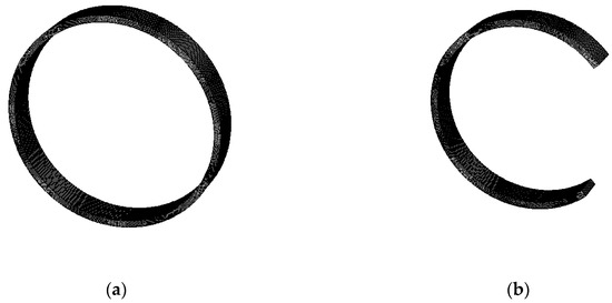 Figure 11 is the finite element model meshing diagrams for the rubber ring vibration isolator, in which Figure 11a is the meshing diagram of the first-stage vibration isolator, and Figure 11b is that of the second-stage vibration isolator. In this paper, the dynamic stiffness parameters of the rubber vibration isolation ring structure were calculated using the frequency domain solver finite element method in the COMSOL Multiphysics software. The outer ring surface of the vibration isolation ring is set as a fixed boundary, and the inner ring surface of the vibration isolation ring is set as a displacement load. The frequency domain range of the dynamic stiffness calculation is from 10 Hz to 1000 Hz. Hexahedral mesh is adopted. The mesh number of the finite element model of the first stage isolator is 81,500. The mesh number of the finite element model of the second stage isolator is 61,125. The properties of rubber materials are close to those of polymer hyperelastic materials. Therefore, the two-parameter Mooney Rivlin hyperelastic materials model is employed as the rubber material model. In addition, the material parameter calculation methods of the two-parameter Mooney Rivlin hyperelastic materials model are illustrated in Equations (14)–(18).
