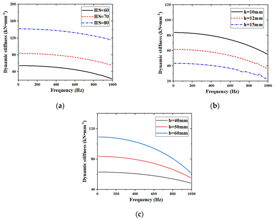 The dynamic stiffness of the first-stage vibration isolator with (a) different material hardnesses, (b) different ring thicknesses, and (c) different ring widths.