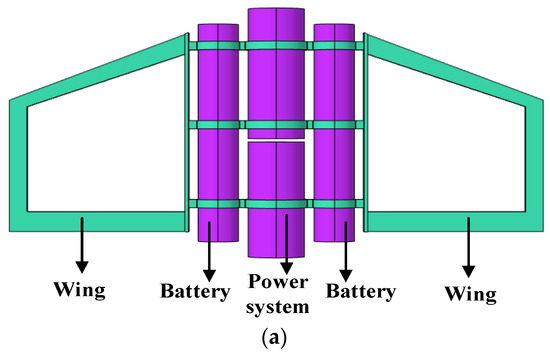 Figure 4 offers the simplified structure of the vibration isolation system of the AUG. Figure 4a shows the AUG with the single-stage vibration isolator. Figure 4b shows the AUG with the two-stage vibration isolator. The AUG is mainly composed of three individual parts (connected by the supporting metal frame), i.e., the power system, the battery and the wing. In Figure 4, mA, mB and mC denote the mass of the power system, the battery and the wing in the AUG, respectively. The first-order vibration isolator is installed between the power system and the battery, and the second-order vibration isolator is installed between the battery and the wing.