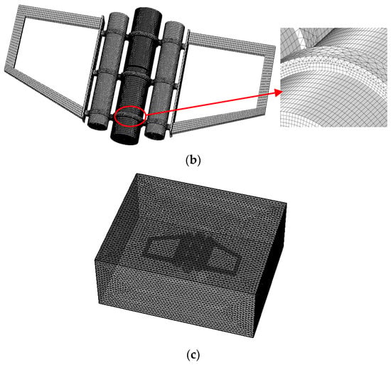 (a) The finite element model of the AUG, (b) the meshing of the AUG, and (c) the acoustic–structure coupling finite element model of the AUG.