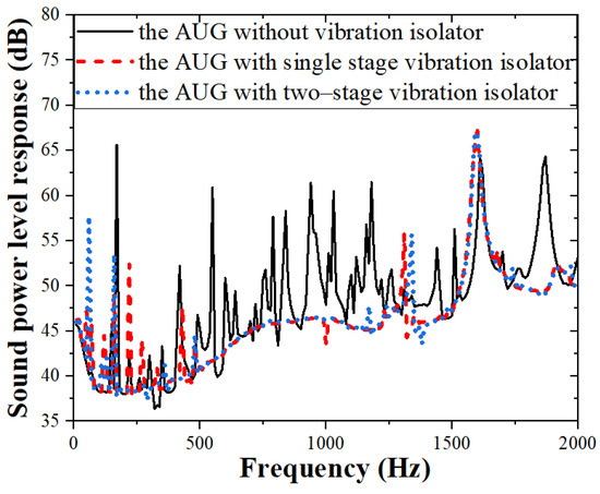 In order to verify the application effect of vibration control with the single- and two-stage vibration isolation on the power system of the AUG, the finite element models of the AUG with single- and two-stage vibration isolators are respectively analyzed. Figure 15 conveys the acceleration frequency responses of the AUG with the single- and two-stage vibration isolators compared with the AUG without the vibration isolator. Figure 15a shows the vibration frequency response of the AUG in air. Figure 15b shows the vibration frequency response of the AUG in water. As seen in Figure 15, the shape decline appears in the acceleration responses of the AUG with the single stage and two-stage vibration isolators in the frequency band above 400 Hz. The acceleration response both in air and water of the AUG with the two-stage vibration isolator declines more than that of the AUG with the single-stage vibration isolator. The result trends of the finite element models are in agreement with those of the dynamic model in Section 3. Figure 16 shows the sound power level frequency response of the AUG in water. As presented in Figure 16, the sound power levels of the AUG with the single- and two-stage vibration isolators decrease tremendously in the middle frequency. The sound power level peaks disappear in the frequency band of 500–1250 Hz. The results imply that a rubber ring vibration isolator is an effective method in controlling the self-noise of the AUG caused by the power system.