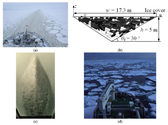 Broken ice is discontinuous, consisting of myriad ice pieces. The ice size, shape, and distribution vary between different types of broken ice, and examples are shown in Figure 1. Brash ice rubbles, Figure 1a, are small compared to other types of broken ice and usually cover ice channels as floating layers with full concentration. The ice rubbles are relatively spherical due to repeating contact with ships and other ice rubbles. Unconsolidated ice ridge rubbles, Figure 1b, share a similar piling feature to brash ice, but the size is larger and the shape is normally not spherical. The ridge keel cross-section can be approximated as a triangle or trapezoid. Sliding ice pieces, Figure 1c, form when ice sheets are broken up by a ship; these have a similar dimension magnitude to ice ridge rubbles. The movement of these ice pieces is restricted by the existence of the intact ice sheets, forming a layer of ice pieces that covers the underwater ship body. Ice floe fields, Figure 1d, are discrete and float on the sea surface. This ice condition is described by its ice concentration, ice diameter, ice thickness, and floe shape. Ice floes with a size greater than the magnitude of ships (>500 m) are considered as level ice sheet from the perspective of ship-ice interaction, which is not within the scope of this paper.