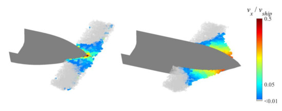 There are several models developed using finite element (FE) software such as LS-DYNA to show the interaction between a ship and ice, and a simplified Arbitrary Lagrange–Eulerian (ALE) algorithm to show the interaction between fluids and solids, as mentioned by Wang and Derradij-Aouat [43], Kim et al. [44], and Guo et al. [14] and Wang et al. [15]. The simplified ALE method calculated fluid drag and added mass according to the submerged volume per ice piece, similar to what is used in [42], which to some extent reflect the hydrodynamic effect, but also cannot account for the ship’s wake. The contact was assumed as pure elastic and the force was determined using a penalty method. All these models have been implemented to simulate ships traveling straight ahead and the resistance prediction has been compared with either refrigerated or synthetic ice tests. In general, the speed dependence of ice resistance is well captured by the simulations, although the deviation in the absolute values may vary substantially.