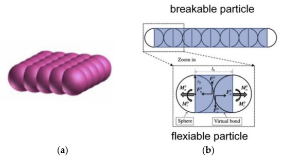 A theoretical view of the methodology for breakable DEM particles [73]: (a) clumped; (b) DEM particles illustration showing breaking up.