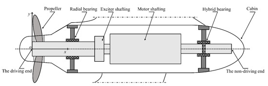 As shown in Figure 1, the podded propulsor shafting system consists of the propeller, motor shafting, exciter shafting, radial bearing, and hybrid bearing composed of a radial roller bearing and a sliding thrust bearing. It can be seen from Figure 1 that the shafting of the podded propulsor is obviously different from the shafting of a traditional diesel engine propulsion system. Firstly, the pod propulsion connects the propeller directly to the driving motor, so the shafting is relatively short. After that, the diameter of the motor shafting and exciter shafting is much larger than the other shafting segments. In addition, there are also differences in materials of the shafting sections (the material of the motor shafting and the exciter shafting is silicon steel; the material of the other shafting sections is carbon steel). Therefore, the podded propulsor shafting system is regarded as a heterogeneous variable cross-section beam. In the modeling and calculation method research, the propeller is simplified to a lumped mass with the moment of inertia. The bearing is simplified to the spring structure. The propeller end of the shafting is defined as the driving end, while the other end of the shafting is defined as the non-driving end.
