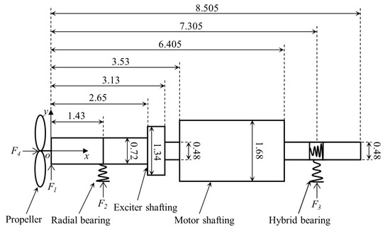 In this paper, a certain type of podded propulsor shafting system is used as the calculation model. The shafting system is divided into seven sections, and the diameter and location of each section are shown in Figure 2. The material of the motor shafting and the exciter shafting is silicon steel with the density of 7800 kg/m3 and elastic modulus of . The material of the other shafting sections is carbon steel, whose density and elastic modulus are 7833.41 kg/m3 and , respectively. A radial roller bearing is arranged on the driving end of the podded propulsor shafting system. A hybrid bearing, which includes a radial roller bearing and a sliding thrust bearing, is arranged on the non-driving end. The stiffness of the radial bearing is . The radial stiffness and axial stiffness of the hybrid bearing are and , respectively. The total mass of the propeller considering the entrained water effect is 30,072.8 kg, and the moment of inertia is 121,838 kg·m2. Take the axle center of the podded propulsor shafting system when it is not deformed as the axis, the direction perpendicular to the axis as the axis to establish a coordinate system. The radial () and axial () excitations of the propeller and the radial excitations (, ) transmitted to the shafting through the bearing are considered. The amplitudes of all excitations are 1 N.