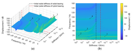 Transverse vibration under different radial bearing stiffness. (a,b) are the vibration response at . (b) is the top view. Numbers and arrows are used to mark the order of the resonance.