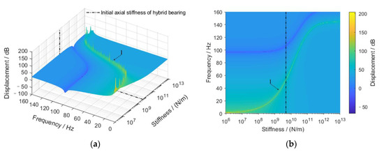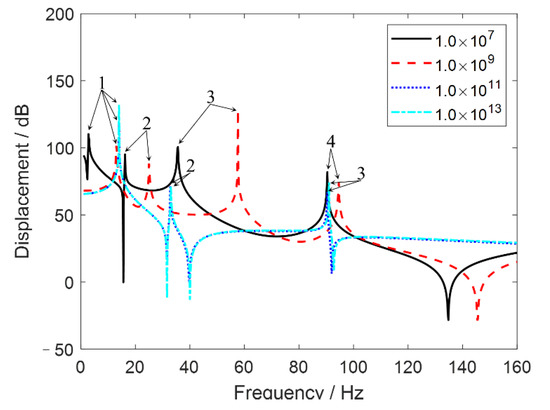 The influence of axial stiffness of hybrid bearing on longitudinal vibration is presented in Figure 6, where the axial excitation on the propeller () is considered. Similar to the transverse vibration, there is also an area in the longitudinal vibration where the resonance frequency has greater sensitivity to the bearing stiffness. However, it is shown that the first resonance frequency goes from 3 Hz to 143 Hz within the axial stiffness changing from to , which indicates that the resonance frequencies of longitudinal vibration change more sharply under different axial bearing stiffnesses than that of transverse vibration.