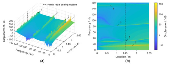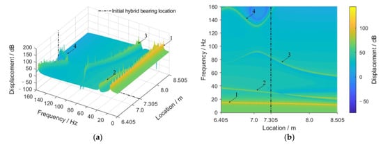 Transverse vibration under different hybrid bearing locations. (a,b) are the vibration response at . (b) is the top view. Numbers and arrows are used to mark the order of the resonance.