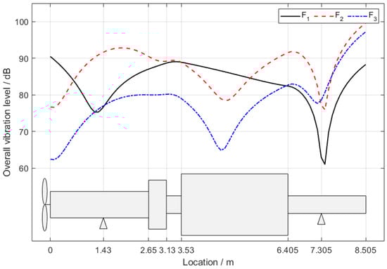 Among the considered four excitations, as shown in Figure 2, , and are all radial excitations, set on the propeller, radial bearing, and hybrid bearing, respectively. Thus, the influence of the excitation location on the transverse vibration characteristics of the podded propulsor shafting system is analyzed in this section. All three excitations are considered as unit forces. In order to compare the vibration level of the entire shafting under different excitations more intuitively, the vibration is described as