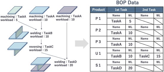 The next step is to create data that define the manufacturing process for each product as defined in the M-BOM data. A unit of work is defined as a task. The execution order between tasks and the workload for each task are defined based on the past performance records. The data that summarizes this information are called the BOP (Bill of Process). Figure 3 shows the example of creating BOP data form the three-plate model. “WL” in the BOP data means the workload. In this example, machining for P1 to P3, welding for U2, reversing, welding for S1 in execution tasks are defined. The welding of U2 and the welding of S1, which are the same task, are distinguished as different tasks because they are performed in different workplaces.