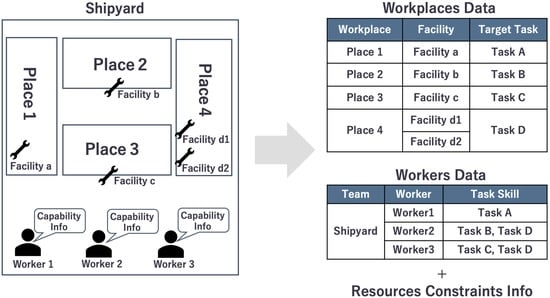 Figure 4 shows the example of creating workplace data and workers’ data. Workplace data indicate facilities located in target workplaces and the tasks that the facilities can be performed. This information can be created from the target factory layout and facilities’ specification information. If necessary, constraints specific to the facilities should be implemented (for example, restrictions on the number of products in a workplace, restrictions on movement between workplaces, etc.). Workers’ data are expressed in terms of who can perform each task. This will be created based on the capability information of each worker ascertained by the production manager. If necessary, attribute information and constraints specific to the workers should be added (skill values to account for differences in abilities among workers, fixed workplaces to be assigned, etc.).