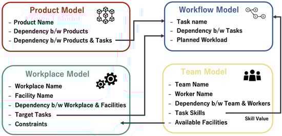 The target shipbuilding process is converted into a simulation model using the required data. We assumed that the simulation model consists of four models: Product, Workflow, Workplace, and Team. Figure 5 shows the contents of each model and these relationships. We will model each of the four models using a graph structure represented by nodes and links based on graph theory [,]. Figure 6 shows the simulation model of the target shipbuilding process according to the following four models. This section shows the contents of each model and how to create each model.
