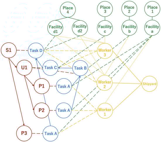 In the workplace model, it represents the facilities, size and dependency information of each workplaces. According to the workplace data, each workplace and each facility is represented by one node. Each node has “name”, “target task” and “dependency” as attributes. The “dependency” expresses the affiliation of each facility by linking the workplace node and the facility node. These relationships are represented as green solid lines in Figure 6. The “target task” expresses which task can be performed by linking facility nodes and task nodes. These relationships are represented as green dashed lines in Figure 6.