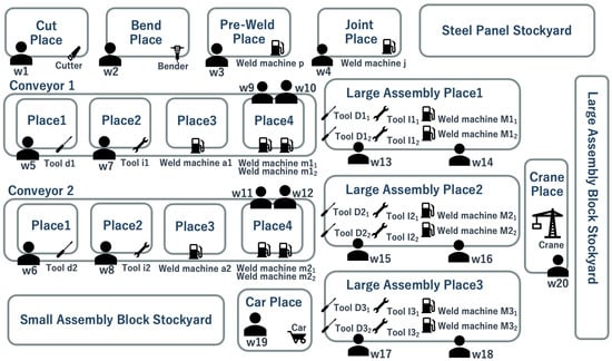 For the production resources of the virtual shipyard, we assumed the layout of the virtual shipyard and the arrangement of workers shown in Figure 9.