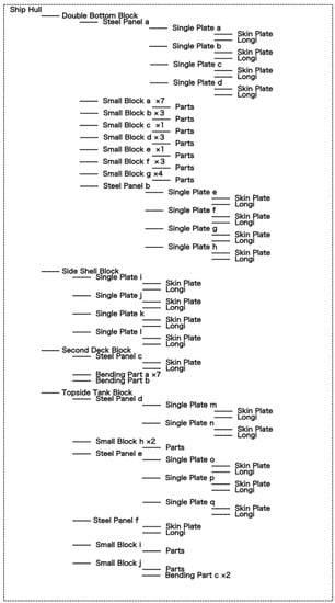 The first step is to create a bill of materials, which shows the parts of the final product down to a single item. This is the basic information required for products in the manufacturing industry to understand the components and how they are assembled [,]. From now on, this data will be referred to as M-BOM (Manufacturing Bill of Material). In the data structure of M-BOM, the parent–child relationship such as parent item and child item is managed in a hierarchical structure based on the assembly order of the product. The parent–child relationship can be considered by dividing the hierarchy as follows: the final product is the “parent”, the processed parts necessary for assembly are the “children”, and the raw materials necessary for further processing are the “grandchildren”. The information given from the design department to the production department is the blueprint and CAD (Computer Aided Design) data, which contain only a diagram or model of the final product. Figure 2 shows how to create M-BOM data from the three-plate model. In the M-BOM data, the final product is divided by defining “intermediate products” as necessary, which are the states including the posture at a certain point of assembly from a single part to a final product (a block, a ship, etc.). The constituent units of intermediate products are determined depending on the following items [,,,]: