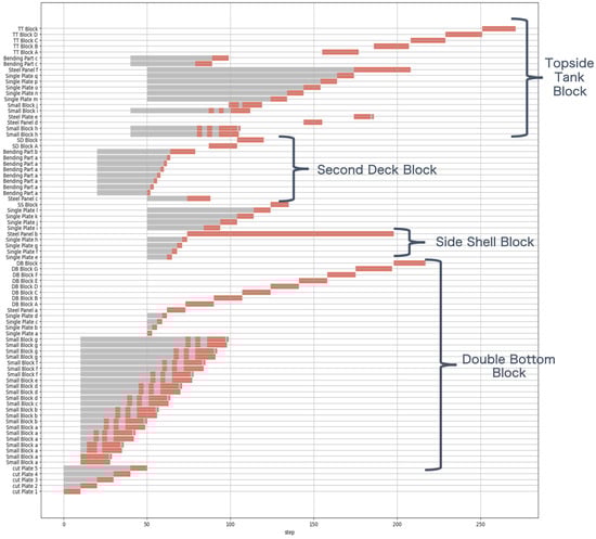Using the simulation model of the shipbuilding process of the virtual shipyard, we can execute the process simulation. The output result shows the proposed production plan for producing the central block of the ship hull. Figure 11 shows the Gantt chart for each product defined in the M-BOM data. The gray area shows the time period of the READY state, and the red area shows the time of the WORKING state of each product.