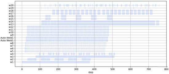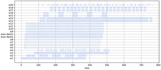 The target of these analyses is the same as in the previous case study of one block production, but here we assume that five blocks are manufactured instead of one. Figure 12 shows the Gantt chart of workers in the original plan. In this section, this result is used as a baseline. The blue area shows the time of the WORKING state of each worker.
