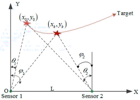 Unlike an active measurement system, a passive sonar system does not emit electromagnetic waves. It detects a target by receiving a radiation signal produced by the target itself or an external irradiation signal reflected by the target. Theoretically, two sensors can determine the unique position of a target in space when the measurement angle and the distance between them are known []. Therefore, a double observation station is used for real-time target tracking in this paper. As shown in Figure 1, the position of sensor 1 is taken as the origin of the coordinate system, the connecting line between sensors 2 and 1 is regarded as the X-axis, and the distance between the two sensors is L meters.