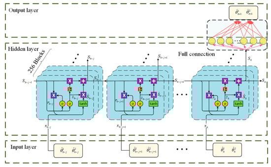 Here, represents the element product formula; and are the weight matrices of and , respectively; is the weight matrix of the output state; is the input data at ; and are the candidate states and output states, respectively, at ; , , and are constants; and and are the and activation functions, which are used to activate the control gate and candidate states, respectively, and are expressed as and . In the hidden layer, each GRU consists of a reset gate and an update gate. The reset gate combines new information with memory to help capture short-term information in the time series. The update gate determines the amount of memory information saved to the current time, which helps the GRU capture long-term correlation. In this way, GRUs can capture the features of time-related measurement information and model the mapping between the previous measurement of the target and the current state of the target.