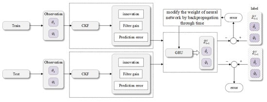 It can be seen from Equation (19) that the error between the updated state estimate value of the CKF and the accurate state is mainly affected by the innovation , the prediction error , and the filter gain . Therefore, based on the measured values from observation to , the steps of passive target state estimation based on the GRU–CKF algorithm are as follows:
