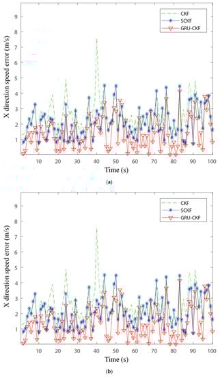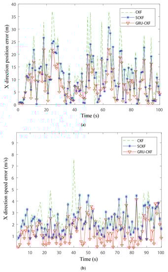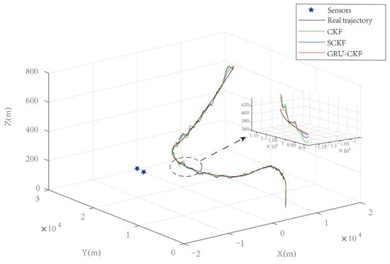 To analyze the performance of the GRU–CKF algorithm, it is compared with the CKF and SCKF algorithms in this section. Figure 4 shows the estimated target trajectories obtained using state estimation methods based on the CKF, SCKF, and GRU–CKF algorithms. It can be clearly seen from the estimated trajectories in Figure 4 that GRU–CKF achieves the best estimation performance in this scenario.