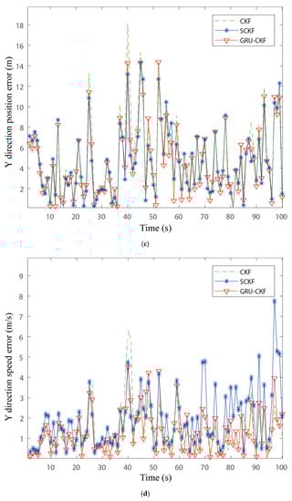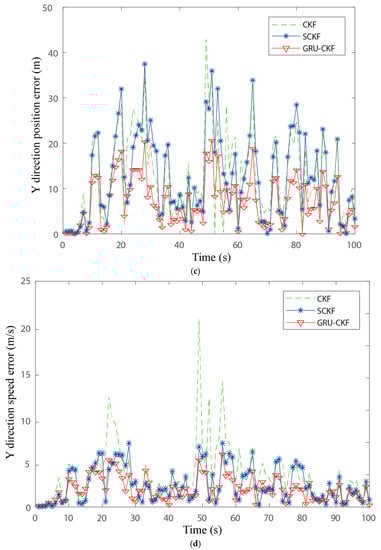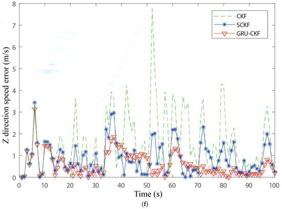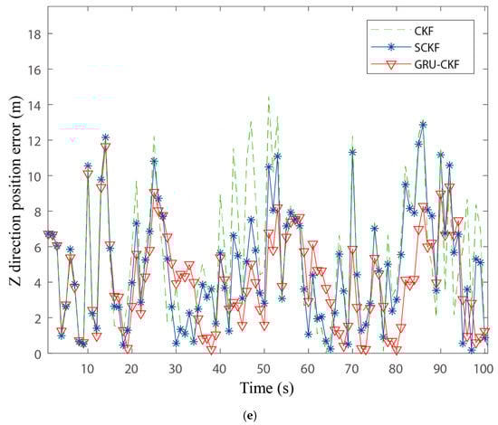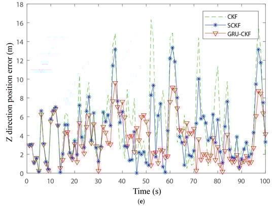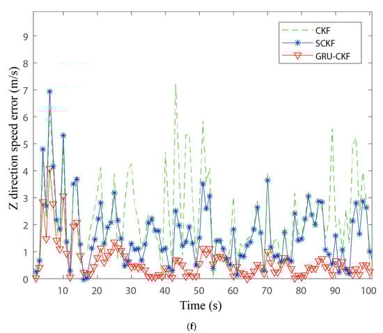 As seen from Figure 5a–d, in the X and Y-axis directions, the RMSEs of the GRU–CKF and SCKF algorithms are similar in both position and velocity. As seen from Figure 5e,f, in Z-axis directions, compared with the other two methods, the GRU–CKF algorithm has the best RMSE in position and speed. After the measurement variance of the observation station is expanded by 10 times, the GRU–CKF algorithm has more obvious advantages with the other two methods, as shown in Figure 6, in the X, Y, and Z-axis directions, the GRU–CKF algorithm not only obtains the lowest position RMSE but also the most stable position RMSE. It can be seen from Table 2 that when the equivalent measurement error rises sharply, the stability of the GRU–CKF algorithm is better than the CKF and SCKF algorithm, and the relative position accuracy is basically consistent with that when the measurement error does not rise. It shows that the GRU–CKF algorithm has high stability. Even if the target suddenly changes its motion state or the measurement error rises sharply, it can still estimate the position of the target with high precision.