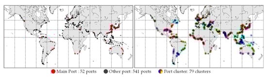 This model defines each port and route served by the Capesize dry bulk carriers. We extracted a list of ports visited by such carriers from the ship movement data on a worldwide scale. The various ports were divided into main ports and port clusters; the former represented each port with significant port calling numbers, and the latter included all the other ports served by the Capesize dry bulk carriers. The port and route network contains 52 main ports and 541 other ports as 79 port clusters, as shown in Figure 2.