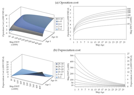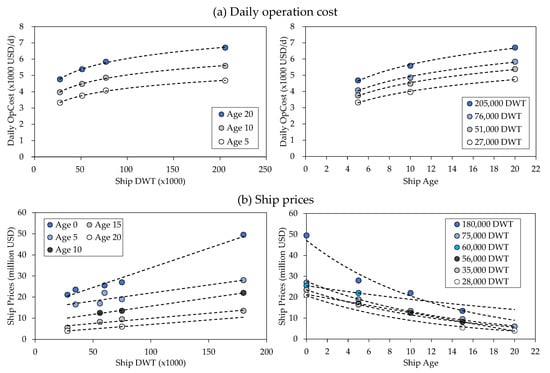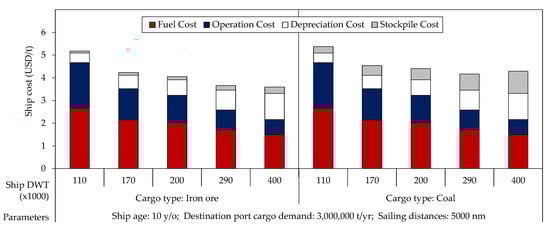 In this study, the ship’s total COST considers the fuel, operation, depreciation, and stockpile costs [1]. The fuel cost represents the cost of the fuel needed to transport specific cargo from the origin port to the destination port. The operation cost describes the cost of operating the ship. It comprises the crew, consumables, repairs, and insurance costs. The depreciation cost defines the reduction in the ship resale price after a year of operation. The stockpile cost depicts the cost of stockpiling transported cargo at the destination port until the cargo is consumed based on the port’s daily cargo movement demand.