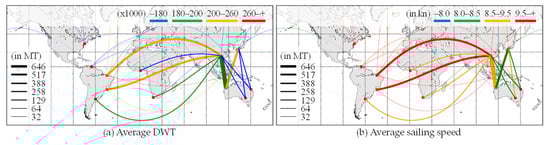 This case study optimized the ship allocation by allowing the existing ships to be replaced by new ships. This allowed us to ascertain the average DWT and sailing speed patterns simultaneously on a global scale. Figure 11 shows the ship allocation results of case study 3. From Figure 11a,c, we can observe that both the case studies allocated ships with a similar average DWT. The major routes displayed in Figure 11b have a uniform average sailing speed of more than 8.5 knots, similar to case study 2. The allocated ships’ lower average sailing speed compared to the actual ship allocation can be seen in Figure 11d. The short- and long-distance routes allocated ships with an average sailing speed of less than 8.5 knots and 8.5–9.5 knots, respectively. This indicated that the importance of sailing speed varied depending on the sailing distance.