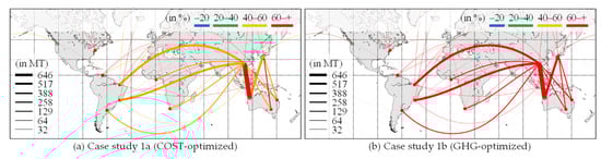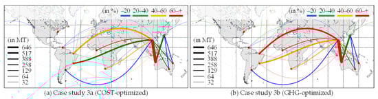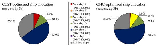 In the previous section, case study 3 specified that notable results could be obtained by optimizing the ship allocation with the new ships instance. The allocated new ship rates of case studies 3a and 3b are shown in Figure 12. The allocated new ship rate was observed to vary depending on the sailing distance. Similarly, in the COST- and GHG-optimized cases, more than 60% of the new ships were allocated in the West Australia–China routes, the major iron ore routes with 646 million tons of cargo movement demands.