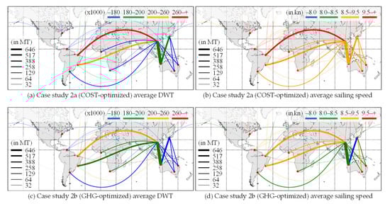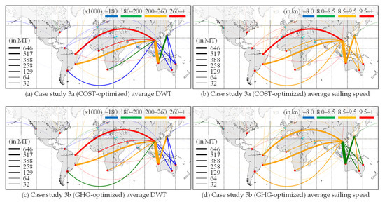 Ship allocation optimization with new ships instance: Case study 3a (COST-optimized) (a) average DWT and (b) sailing speed; case study 3b (GHG-optimized) (c) average DWT and (d) sailing speed.