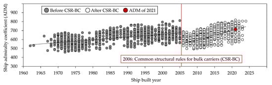 Ship admiralty coefficient (ADM) before and after common structural rules for bulk carriers (CSR-BC) [41,51,52].