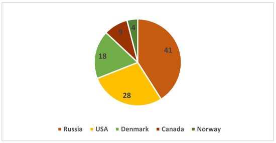 The structure of undiscovered Arctic oil reserves by states, %. Data from [25,26].