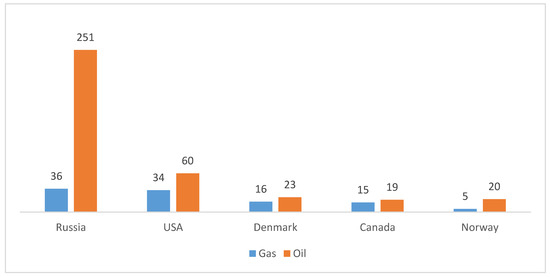 Based on the indicated methods, below we note the results of the studies. The conducted comparative statistical study made it possible to show that the undoubted strength of the production of offshore hydrocarbons in the Arctic is that several companies already operate in these conditions and have unique experience in the special offshore conditions of the Arctic [19,20]. This, combined with the fact that Russia’s merchant fleet has a strong position in the world, allows it to compete successfully in the future. Abroad, the development of marine hydrocarbon resources in the Arctic is carried out mainly in the United States (Alaska) and Norway. In the US, oil production is carried out by such major companies as ExxonMobil, BP, Shell and others. The Arctic and the Northern Sea Route are one of the main growth drivers for the oil and gas industry in the coming decades [21], and fuel and energy facilities act as a «locomotive» for the formation of regional infrastructure and accelerate the socio-economic development of the Arctic [22]. According to the National Petroleum Council, the Arctic accounts for up to 25% of all undiscovered traditional hydrocarbon resources of the planet, of which the discovered oil and gas reserves in this region amount to 191 billion barrels of oil equivalent, and potential resources are estimated at 525 billion barrels of oil equivalent, a significant part of the hydrocarbon potential of the Arctic falls on the shelf of the Arctic seas (Table 1).