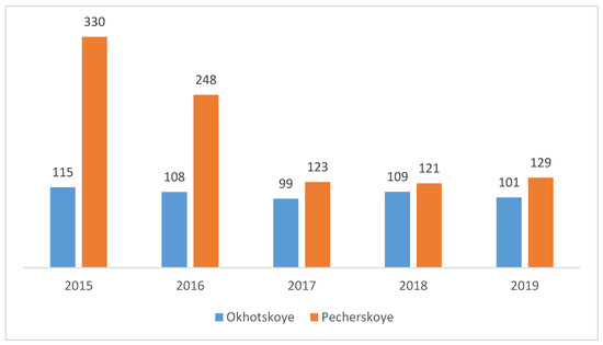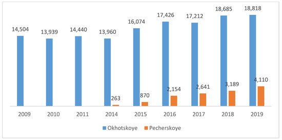 As we can see, hydrocarbons are mainly produced in the Sea of Okhotsk, but since 2014, the Pechora Sea has been employed, with the growth rate being even higher (Figure 5).