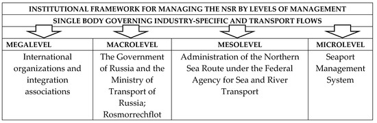 This study reveals the problem of the extraction of hydrocarbon resources in its totality, covering the possibility of the institutional and legal regulation of the development of the Arctic zone, taking into account the satisfaction of the needs of all stakeholders. We substantiate the need for the four-level interaction at the mega-level, macro-level, meso-level and micro-level, aimed at a comprehensive response to any problem that emerges. The institutional framework for managing the development of the Northern Sea Route (hereinafter referred to as the NSR), proposed in this article to improve the efficiency of the extraction of hydrocarbon resources in the Arctic Region, can ensure the purposeful and effective development of the region and its infrastructure, which is one of the priorities of public administration in the development of international relations [18].
