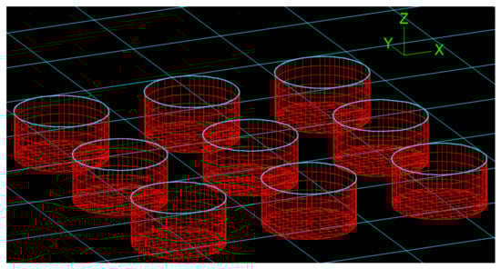 In addition, a diffraction occurs around the body (system of nine cylinders with panels and frames) because the wave field near the structure is disturbed. For example, the vertical diffraction force can be estimated by Equation (10), assuming that wavelengths are larger than the characteristic length of the structure: