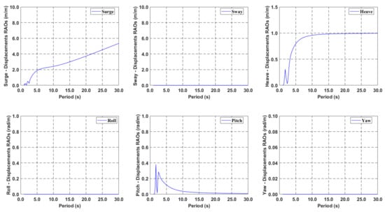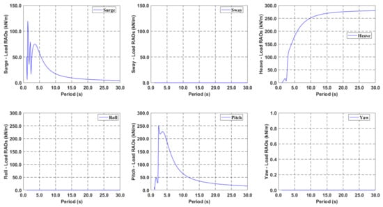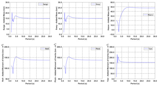 As explained previously, hydrodynamic coefficients (added mass/inertia, radiation damping, load response amplitude operator (RAO), and displacement RAO) are required to analyze dynamic responses of the floating system. In this study, a frequency-domain simulation was conducted using OrcaWave. The geometric panel mesh for the floating solar panel system is shown in Figure 1. The floating solar panel system comprises of nine single-unit cylinders, arranged in parallel (horizontally and vertically, 3 m apart from each other). The pontoon (group of nine cylinders) are connected to each other with a frame, so that they can oscillate together. Additionally, in this study, the pontoon (nine cylinders with panels and frames) is considered as rigid. Additionally, as shown in Figure 1, hydrodynamic coefficients are computed based on a set of nine cylinders with 6DOF (degrees of freedom). The specifications of the floating solar panel system are listed in Table 1. Moreover, 893 meshes were modelled with quarter symmetry under a 1 m unit length. A wave period of 1–30 s was considered during the numerical simulation, and a wave heading of 0° was considered for comparative analysis. Furthermore, the sea water density and depth were 1025 kg/m3 and 50 m, respectively. In addition, hydrostatic restoring coefficients, which were obtained from the frequency-domain analysis, are listed in Table 2. Figure 2, Figure 3, Figure 4 and Figure 5 show the added mass/inertia, radiation damping, load RAOs, and displacement RAOs under 0°, respectively.