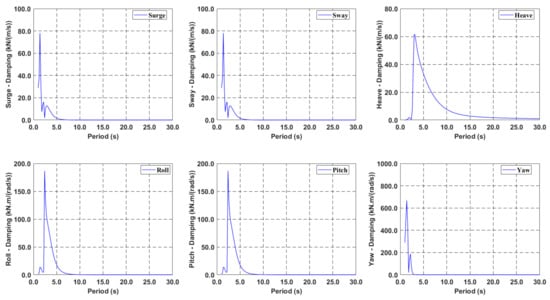 Furthermore, the hydrodynamic damping load, owing to the dynamic behavior of the floating structure, should be considered. In general, generated waves, owing to the dynamic behaviors of the floating structure, can weaken incident waves; thus, it is known as radiation damping, which is a result of waves generated by body (system of nine cylinders with panels and frames) motions.