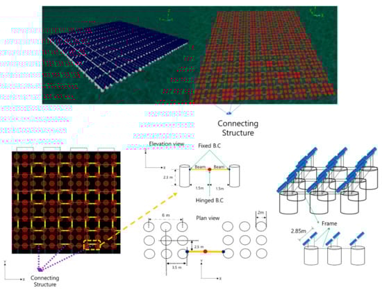 Even though the floating solar panel system is an active research area, to the best of our knowledge, there are no reported studies, with respect to the dynamic behavior of multiconnected floating solar panel systems with vertical pontoon (or cylinder) types, even though vertical pontoon (or cylinder) design has several advantages, such as manufacturing costs reduction and anti-corrosion, due to small, wet surface. Thus, in this study, a fully coupled multiconnected floating solar panel system with a vertical pontoon (or cylinder) model is established, and a numerical simulation is performed to verify the dynamic response of the system in the following sections.