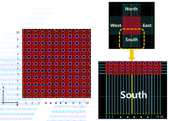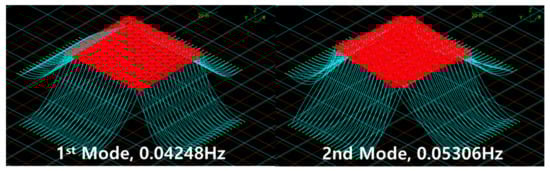 Figure 6 shows the configuration of the base model for the floating solar panel system. The entire system consists of a 10 × 10 floating solar panel pontoon (combined with nine parallel-arranged, single-unit vertical cylinders) and mooring systems. As shown in Figure 7, each mooring group consists of 20 MLs and four mooring groups (80 MLs) are installed to enhance the station-keeping capability. Each ML was modelled using a steel wire rope. The length of each line is 90 m. Details of the mooring material properties are listed in Table 3. Furthermore, each floating solar panel system is connected to a steel pipe-type connecting structure, and a hinged connector is attached at the connecting point of each steel pipe, while it is fixed at each pontoon. The material properties of the connector are listed in Table 4. The configurations of the environmental heading, floater dynamic response, and mooring tension measuring locations are plotted in Figure 7. Considering heading directions, floater dynamic responses were measured in nine locations: northwest (NW), north (N), northeast (NE), west (W), center, east (E), southwest (SW), south (S), and southeast (SE). For mooring tension, four lines are selected at the north, south, west, and east, and it is measured at fairlead, which connects the floater with the ML. The configuration of the floater and ML numbering is shown in Figure 8. With respect to load cases, two simulation conditions, normal operating and extreme, were selected (Table 5). In this study, a widely adopted JONSWAP (Joint North Sea Wave Project) spectrum was used for random wave generation, and regular wave components were superimposed for random wave signals. Using the equal energy method (each regular wave component exhibits equal spectral energy), the repetition of the wave signal in the random wave generation process can be avoided. The sharp parameter (gamma) of the wave spectrum is used in Section 2.2. In addition, in this study, the wake effect caused by the parallel layout of the floating solar panel system was not considered. As listed in Table 6, based on modal analysis, the natural frequencies of the target system are 0.04248 (1st mode) and 0.05306 Hz (2nd mode). Owing to the geometrical symmetry of the system, the surge and sway direction natural frequencies were identical (Figure 9).